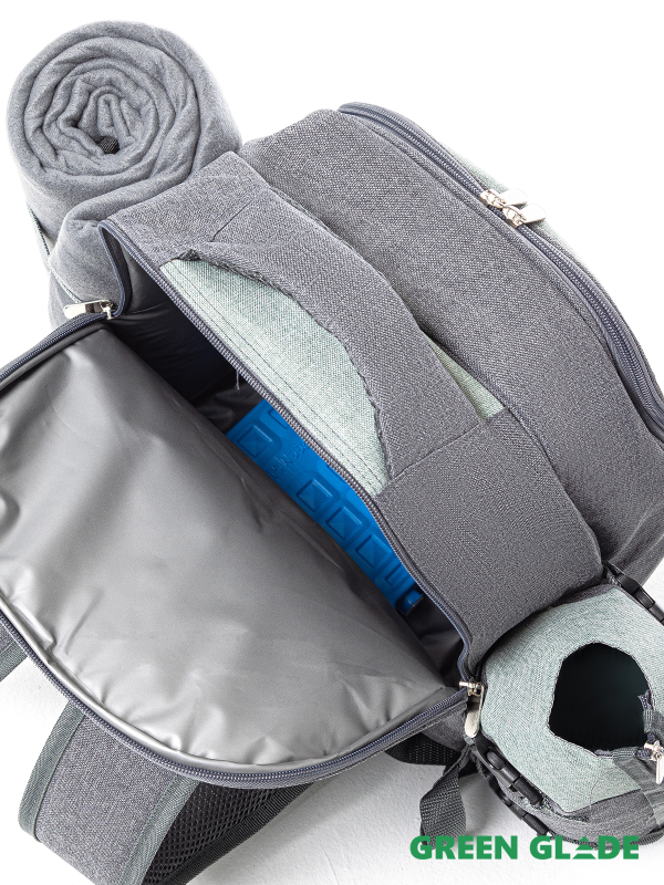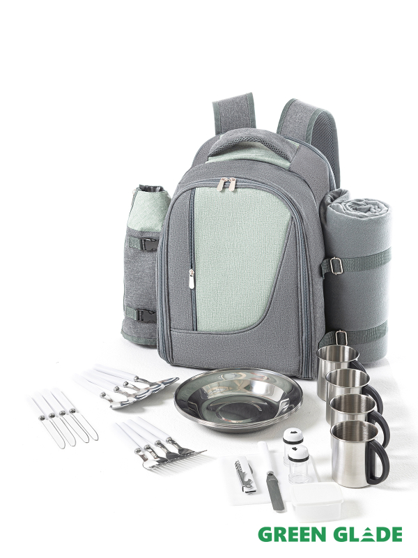 • Количество предметов в сумке на 4 персоны: 27 предметов (ножи, вилки, ложки, чашки, тарелки, солонка, перечница, штопор, нож для сыра/масла, разделочная доска, емкость для сыра/масла, плед)
