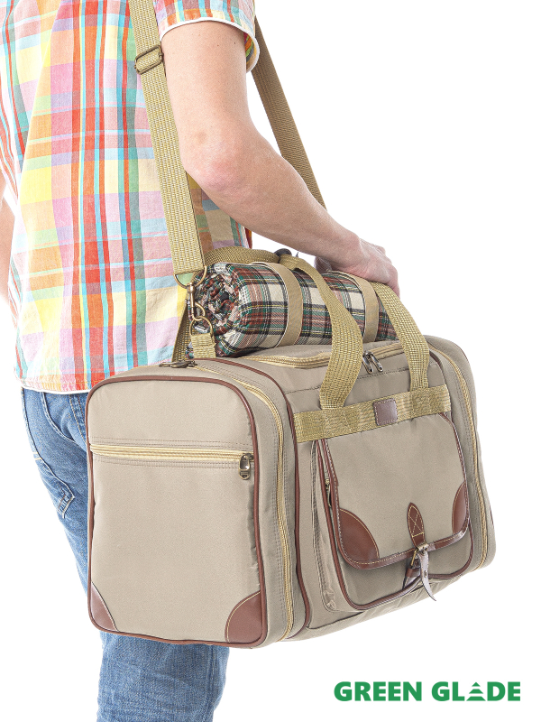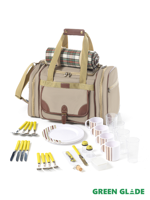 • Количество предметов в сумке на 4 персоны: 32 шт. (ножи, вилки, ложки, стаканчики, кружки, тарелки, солонка, перечница, штопор, нож для сыра/масла, емкость для сыра/масла, разделочная доска, пробка для бутылки, плед)