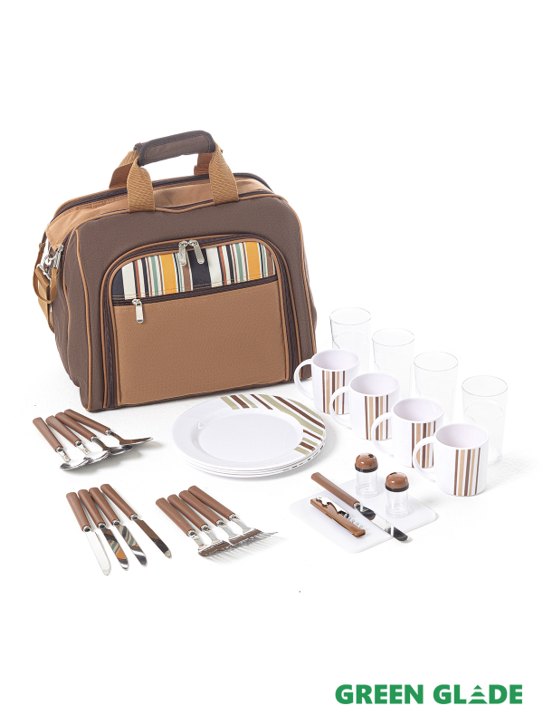 • Количество предметов в сумке на 4 персоны: 29 штук (ножи, вилки, ложки, стаканы, кружки, тарелки, солонка, перечница, штопор, нож для сыра/масла, разделочная доска)