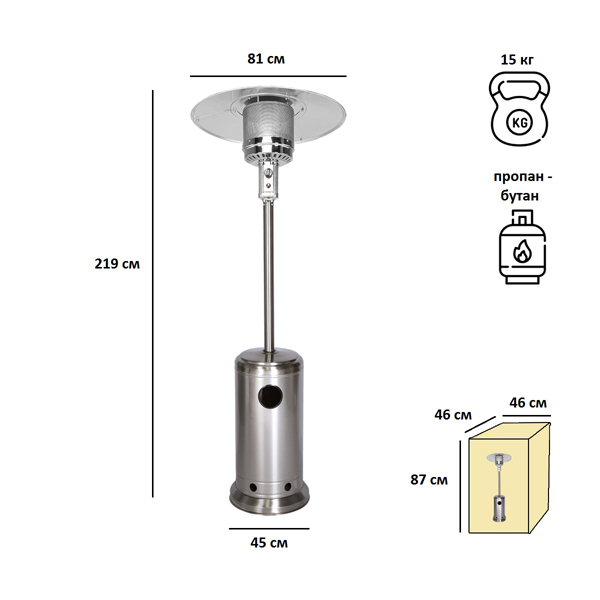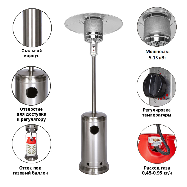 Обогреватель Aesto A-02T сделан из нержавеющей стали, благодаря чему выглядит красиво и ему не страшны царапины или небольшие механические повреждения. Подходит под любой газовый баллон до 27 л включительно (высота 59 см, диаметр 30 см). Газовый баллон в комплект не входит, регулятор и шланг – входят.