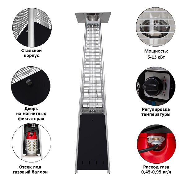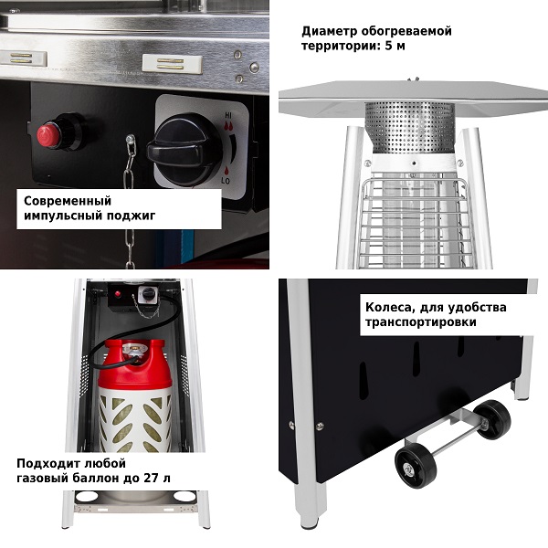 Подходит под любой газовый баллон до 27 л включительно (высота 59 см, диаметр 30 см). Газовый баллон в комплект не входит, регулятор и шланг – входят.