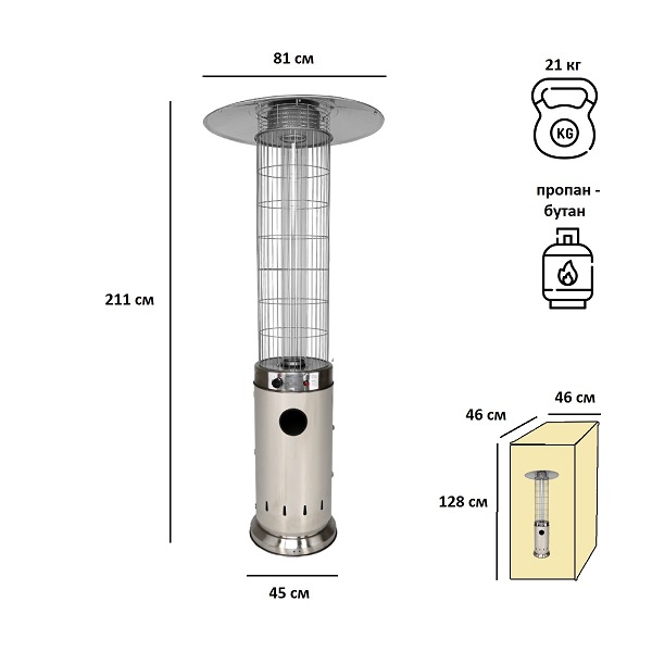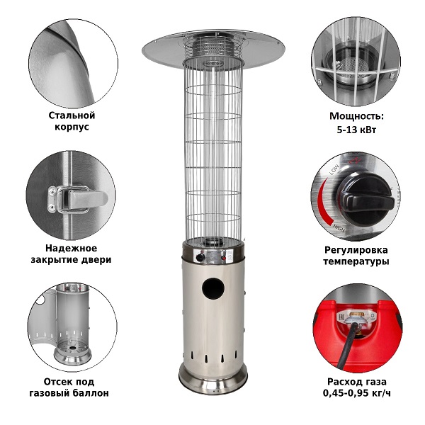 Обогреватель Aesto A-07T сделан из нержавеющей стали, благодаря чему выглядит красиво и ему не страшны царапины или небольшие механические повреждения. Подходит под любой газовый баллон до 27 л включительно (высота 59 см, диаметр 30 см). Газовый баллон в комплект не входит, регулятор и шланг – входят.