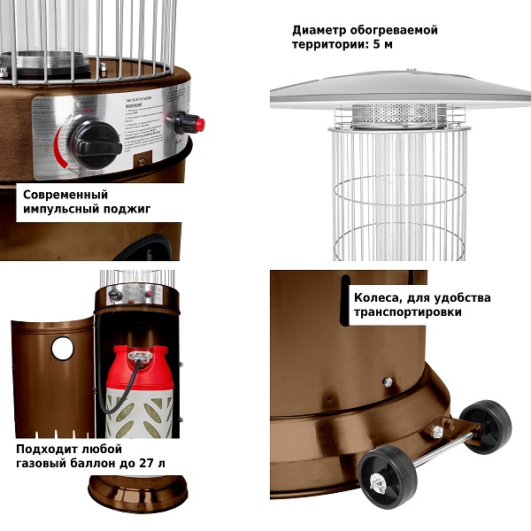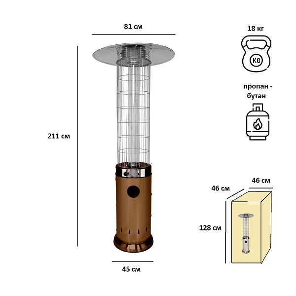 Подходит под любой газовый баллон до 27 л включительно (высота 59 см, диаметр 30 см). Газовый баллон в комплект не входит, регулятор и шланг – входят.