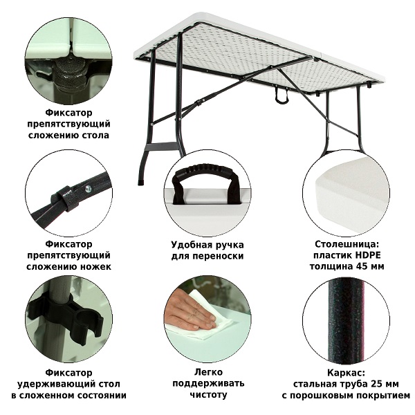 Среди преимуществ складного пластикового стола Green Glade F152 можно также отметить возможность фиксации ножек.